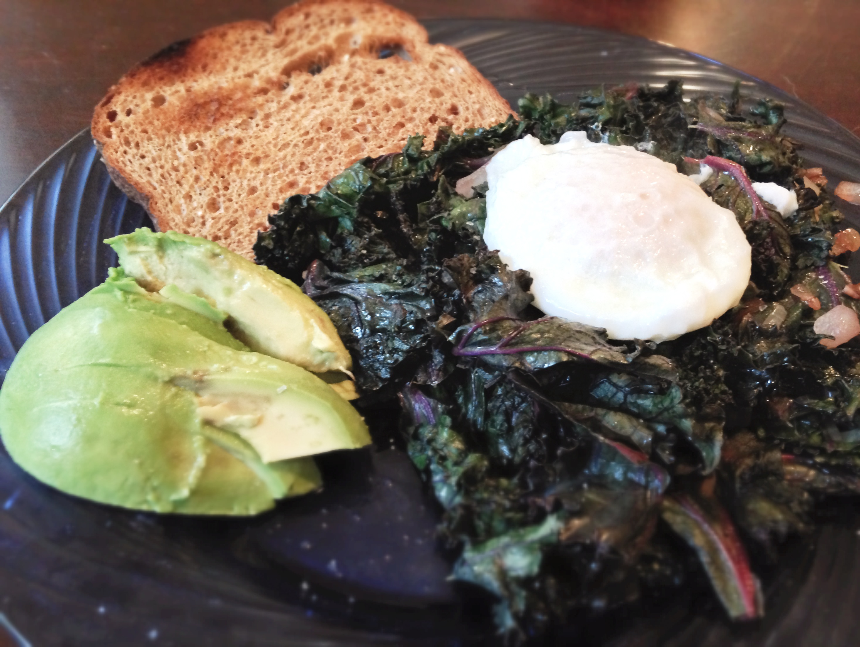 I had to try to make these eggs. I love poached eggs and toast so I toasted some bread then realized that we had some red kale that would sauté nicely with onions, garlic, and balsamic vinegar. Given that I had just done a crazy strength workout I also added some sliced avocado. Guess what? It was amazing! By far the easiest poached egg I’ve made and also beautiful enough to serve to guests!