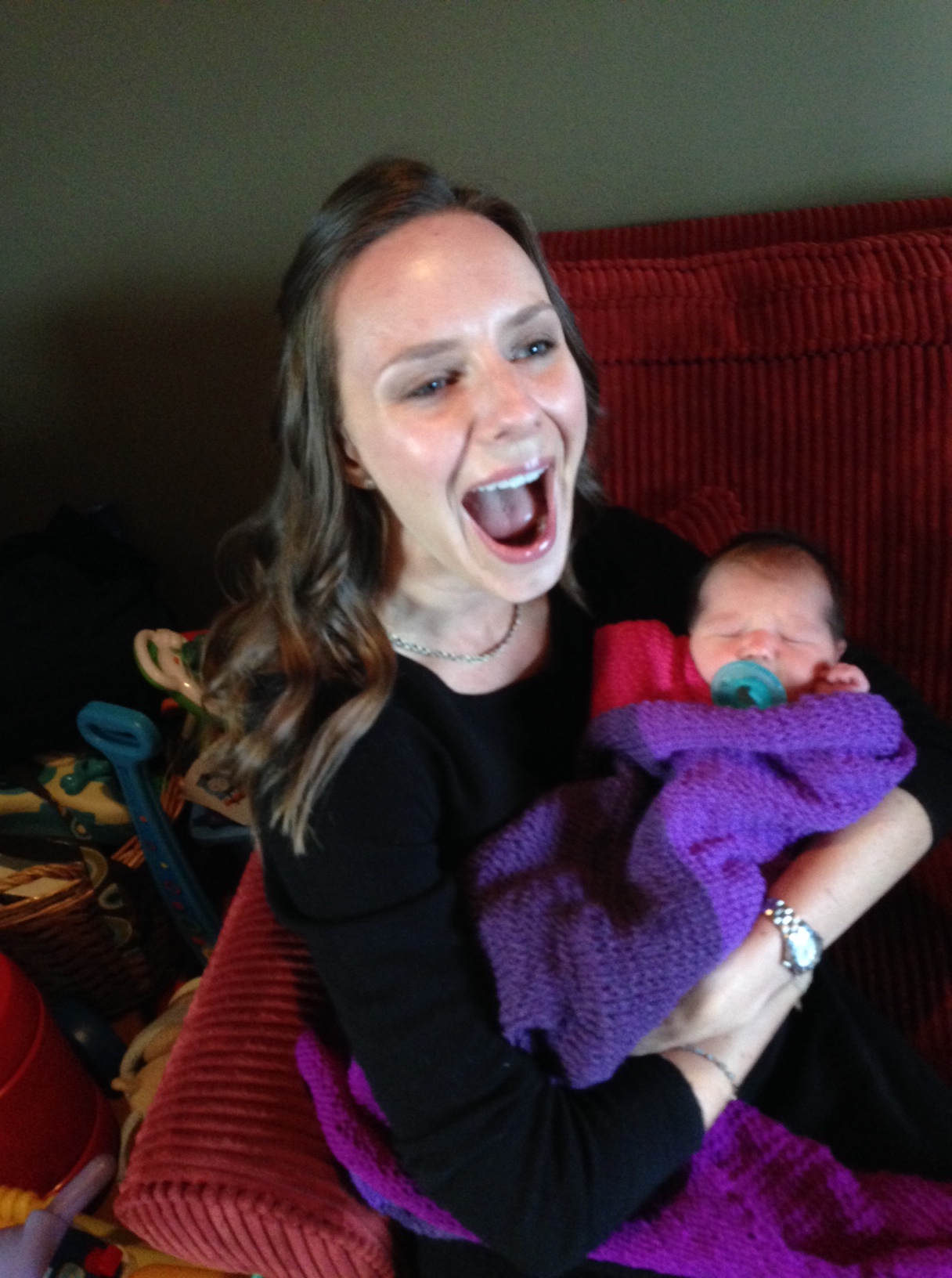This is a horrible picture of me, but I think it captures how excited I am to be holding her for the first time. Also, check out the blanket I knit her!